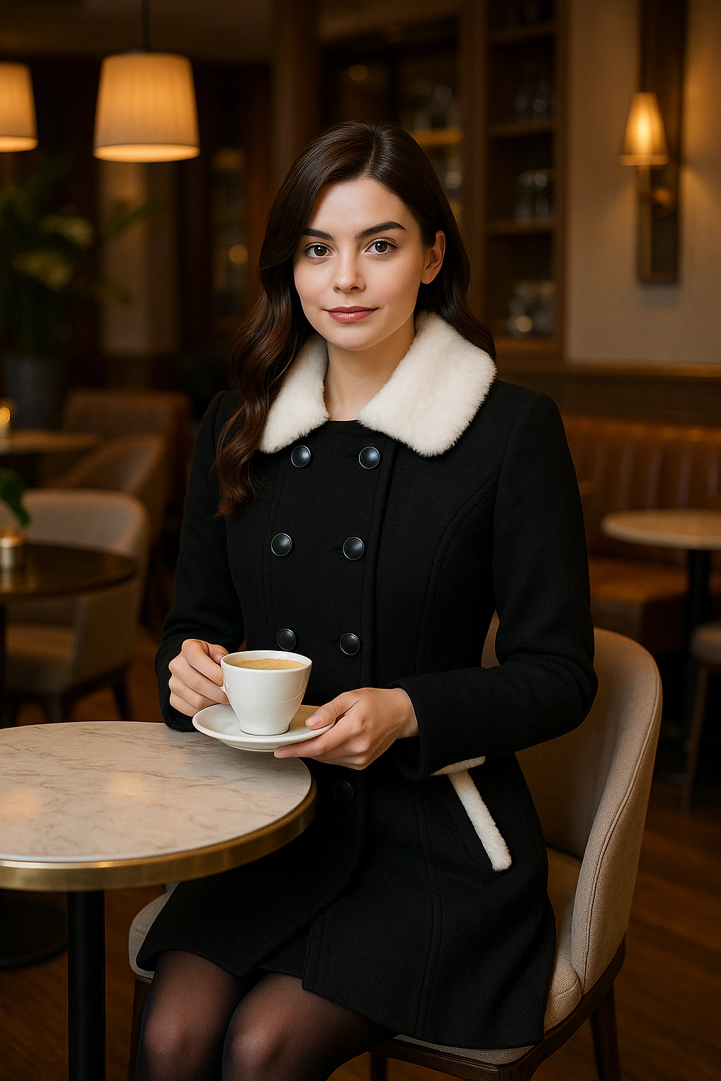 O design clássico de abotoamento duplo frontal com botões , enquanto o gola em pelúcia branca adiciona um charme atemporal e proporciona proteção extra contra o frio. Os bolsos frontais também contam com acabamento em pelúcia, criando um contraste delicado e moderno com o corpo do casaco em tom preto.