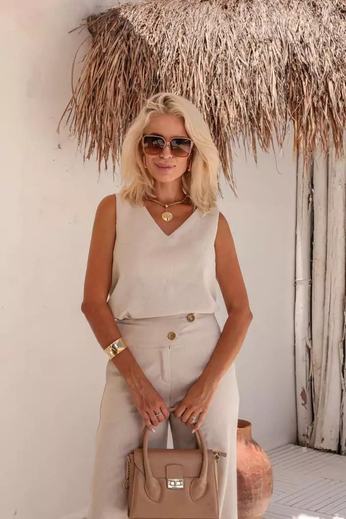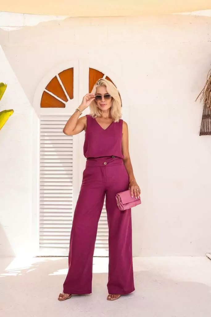 Calça pantolona com bolsos frontais e forro traseiro (100% poliéster) fechamento em zíper e dois botões dourado cos anatômico.