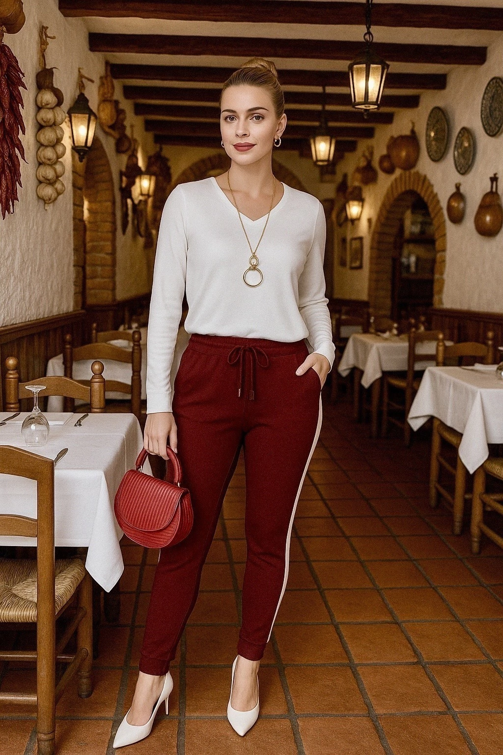 Conjunto com blusa manga longa e detalhe em outra cor na calça.