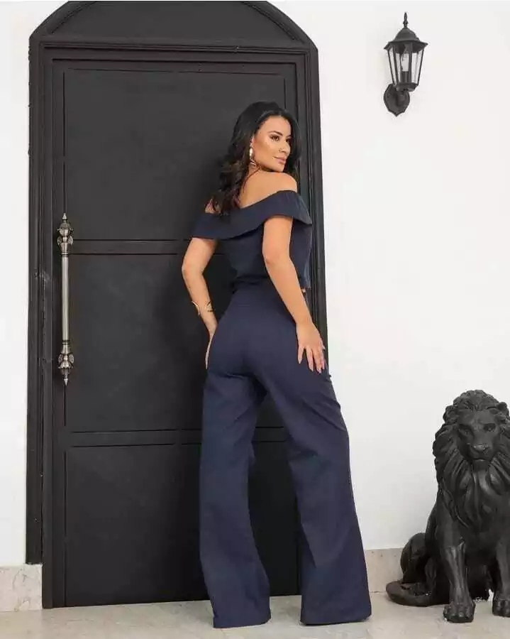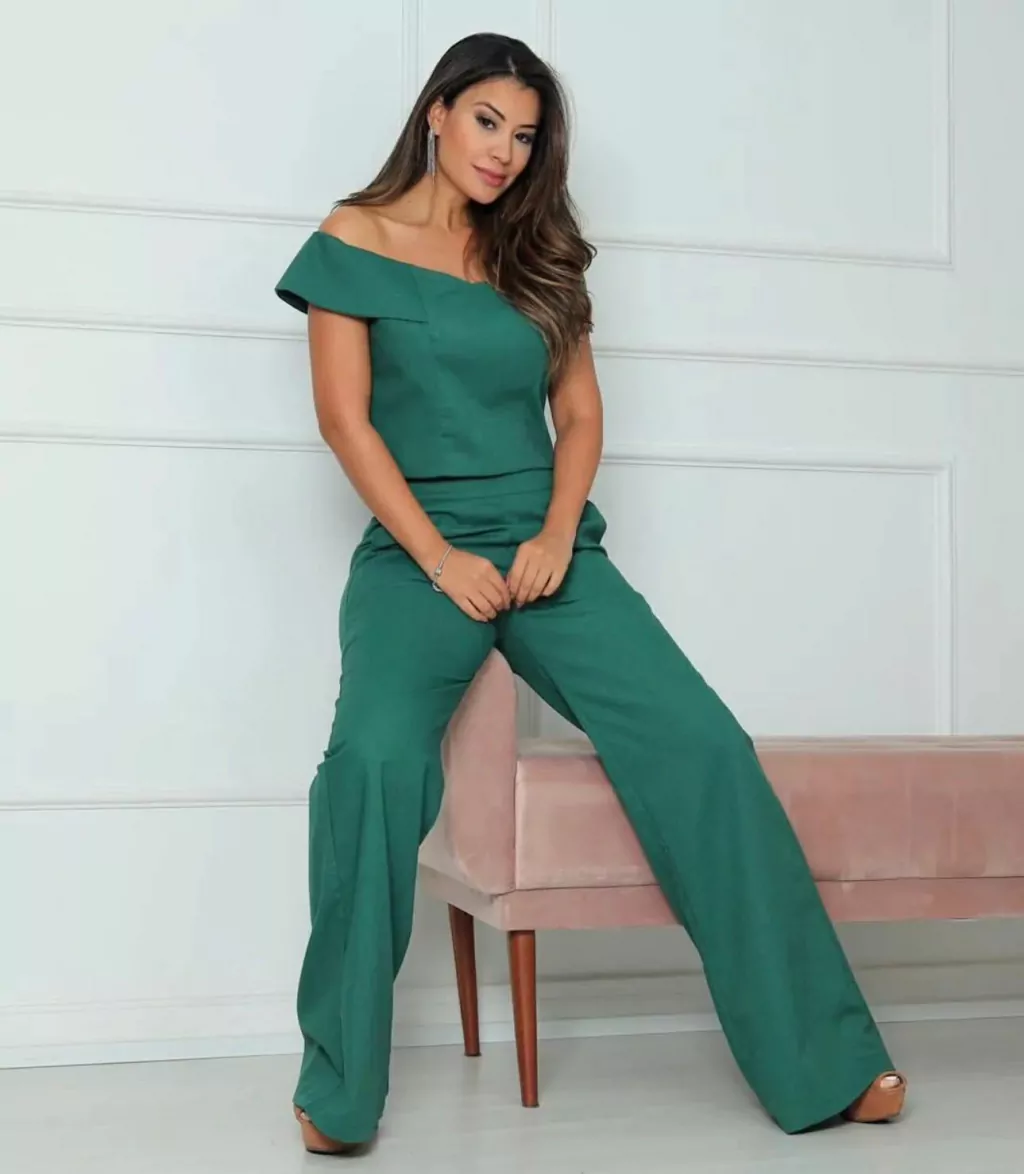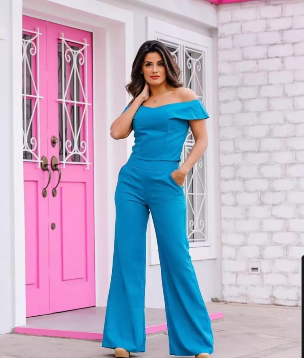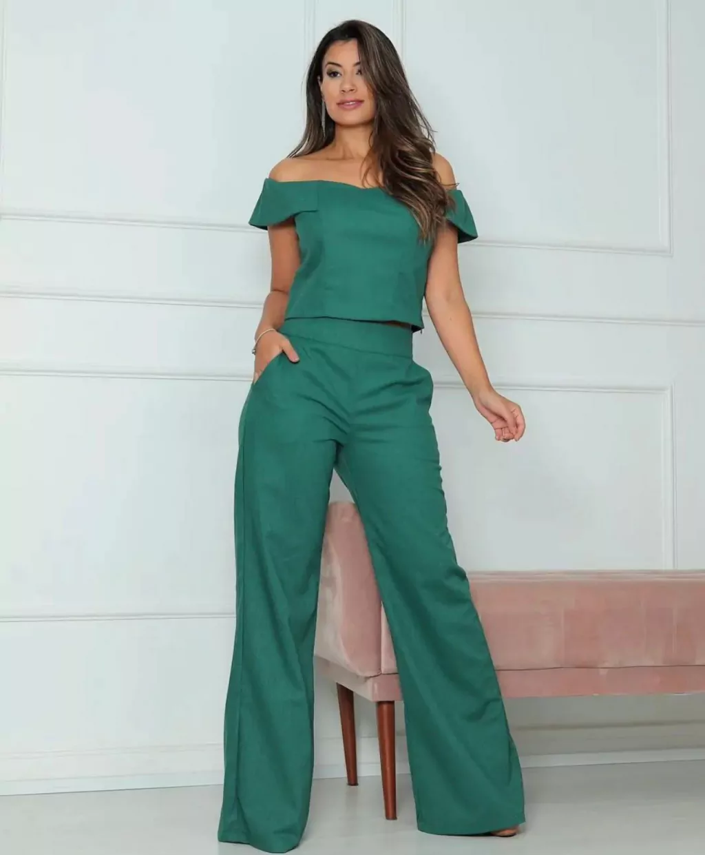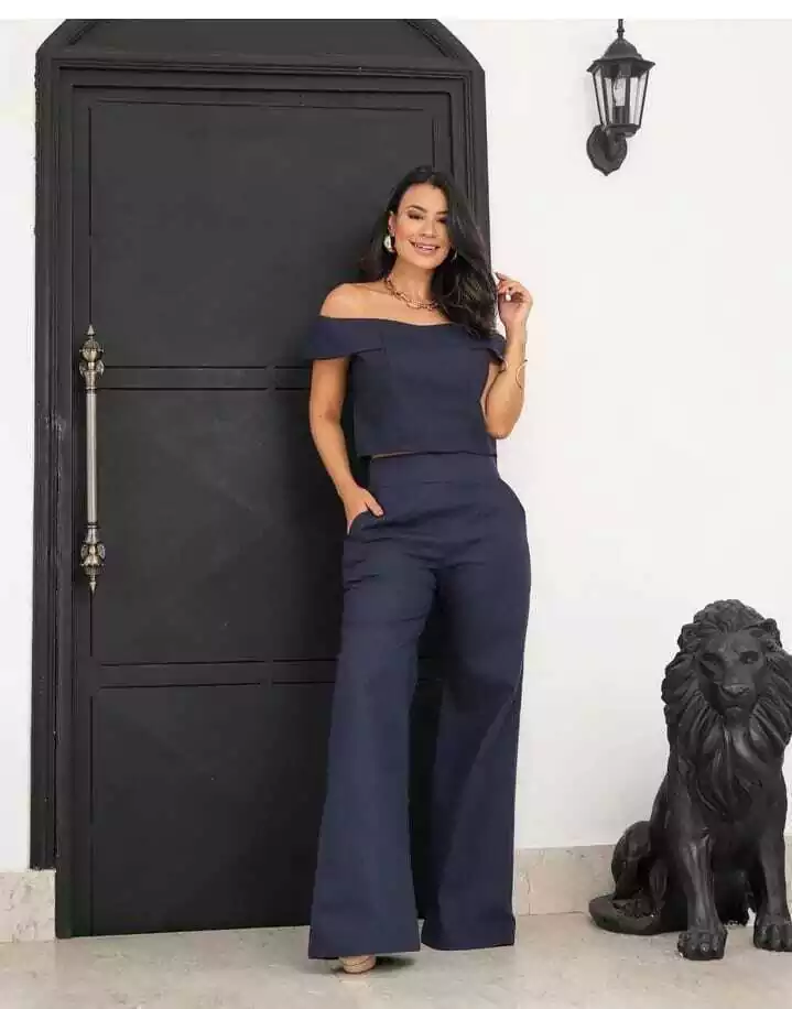 O conjunto inclui uma blusa sofisticada com design ombro a ombro e uma calça pantalona que proporciona um caimento impecável. Ideal para compor looks tanto casuais quanto mais formais, garantindo que você sempre esteja na moda.