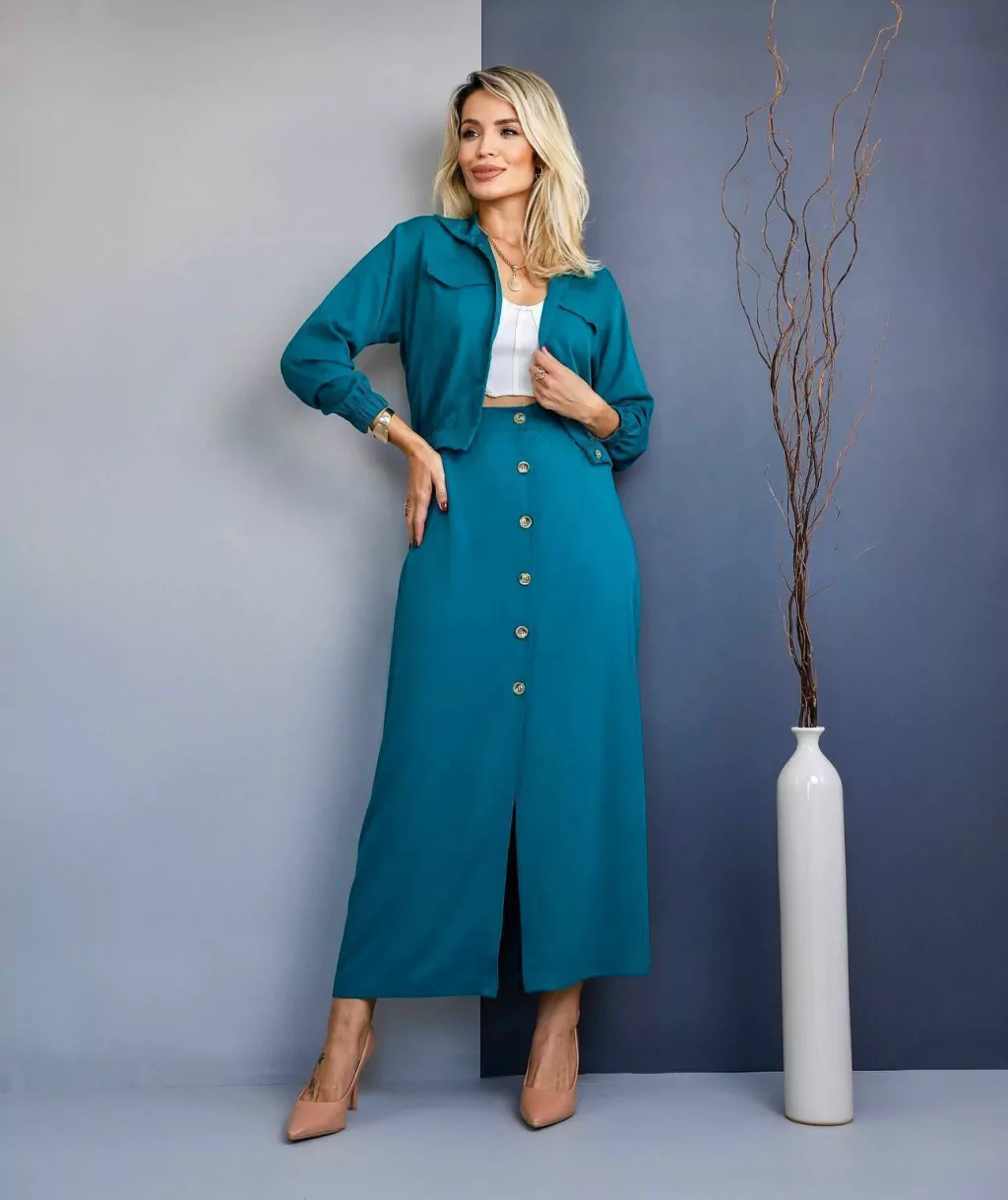 Apresentamos o Conjunto Saia Longa e Casaco Botões Viscose Raschele, uma escolha sofisticada que combina elegância e conforto. Este conjunto é ideal para mulheres que desejam destacar-se em qualquer ocasião, trazendo um toque de classe ao seu guarda-roupa.
