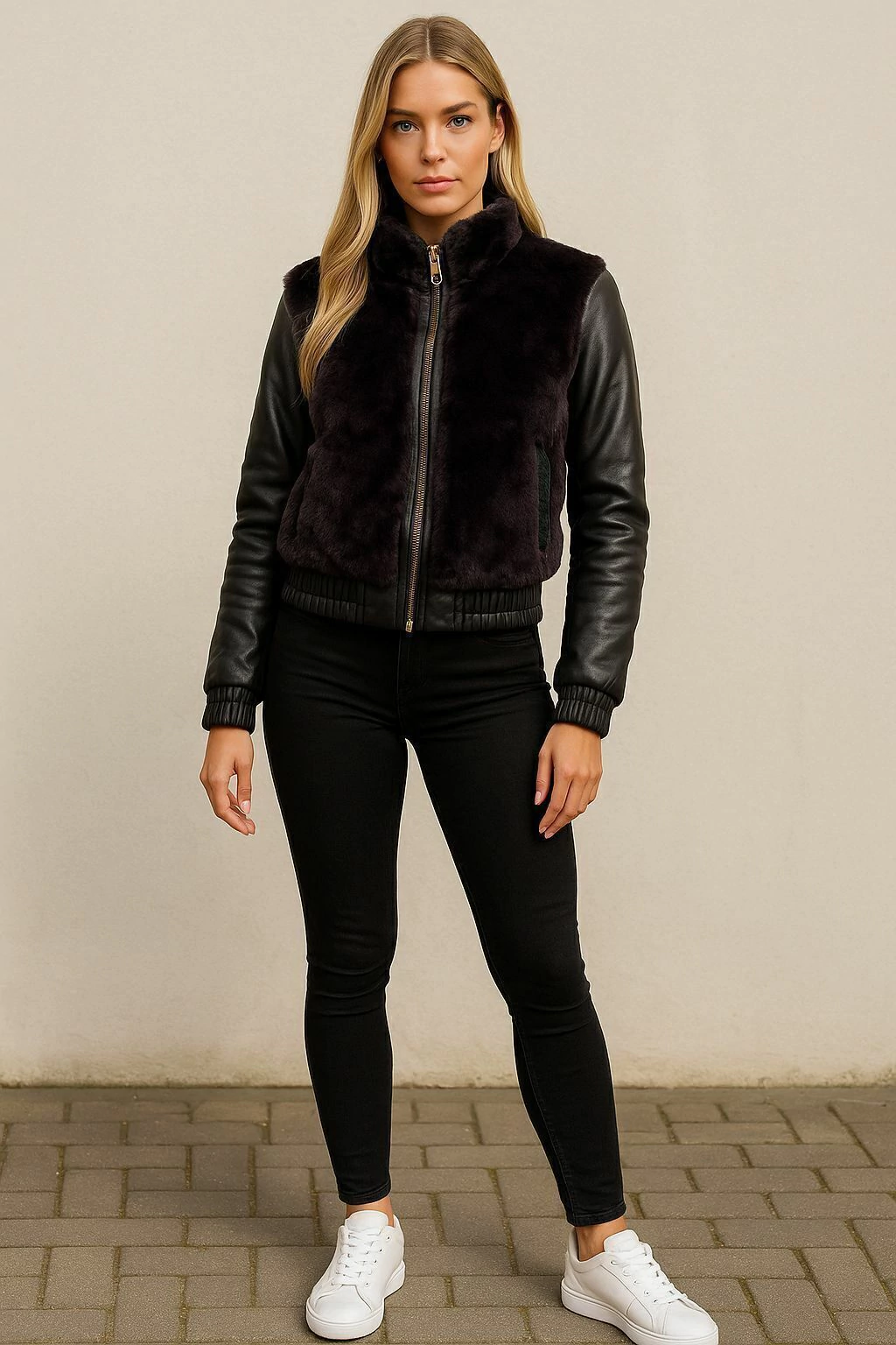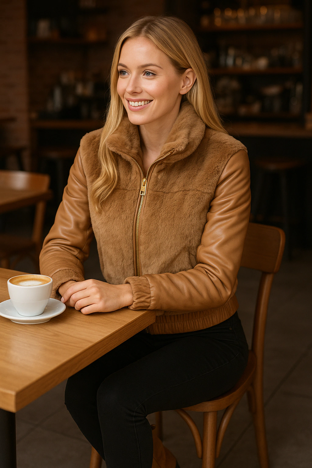 Deixe seus looks de inverno ainda mais estilosos e quentinhos com essa jaqueta feminina em couro sintético com detalhes em pelinho macio!
