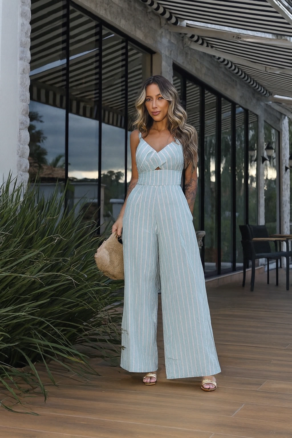 O macacão possui elástico na parte de trás e amarração, trazendo conforto e ajuste perfeito.