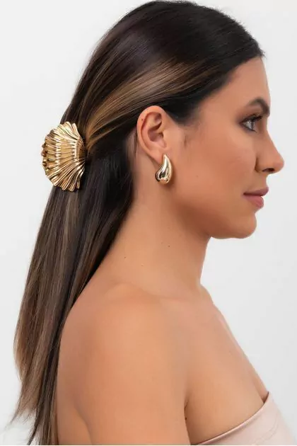 Adicione um toque de luxo e estilo ao seu penteado com esta presilha de cabelo dourada em formato de concha. Perfeita para complementar looks sofisticados, seja em festas, casamentos, lual, praia ou eventos formais.
