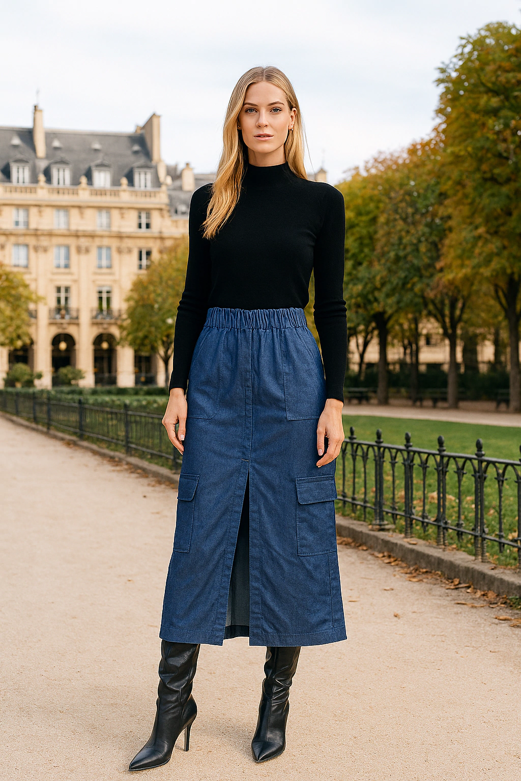 Renove seu guarda-roupa com essa linda saia midi feminina confeccionada em tecido chambray, perfeita para compor looks modernos, confortáveis e sofisticados.
